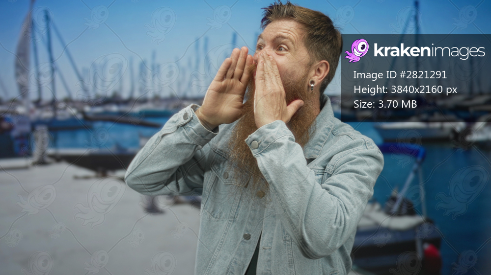 Man with red beard shouting with cupped hands at his mouth at a sunny marina port next to moored boats on a concrete pier; excitement.