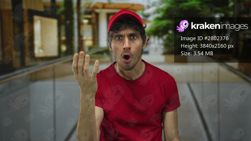 Man with red cap pointing head to temple on city street outside storefront glass railings; idea thinking.
