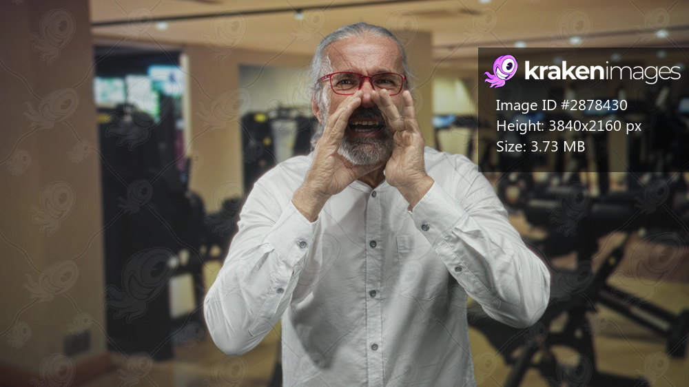 Man with red glasses cupping hands and shouting across gymnasium training area filled with exercise machines; motivation determination energy.
