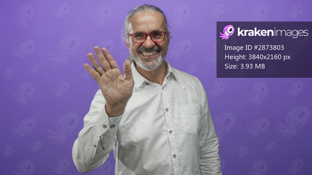 Man with red glasses waving hand in studio with purple backdrop and white shirt, smiling and palm raised; warmth.