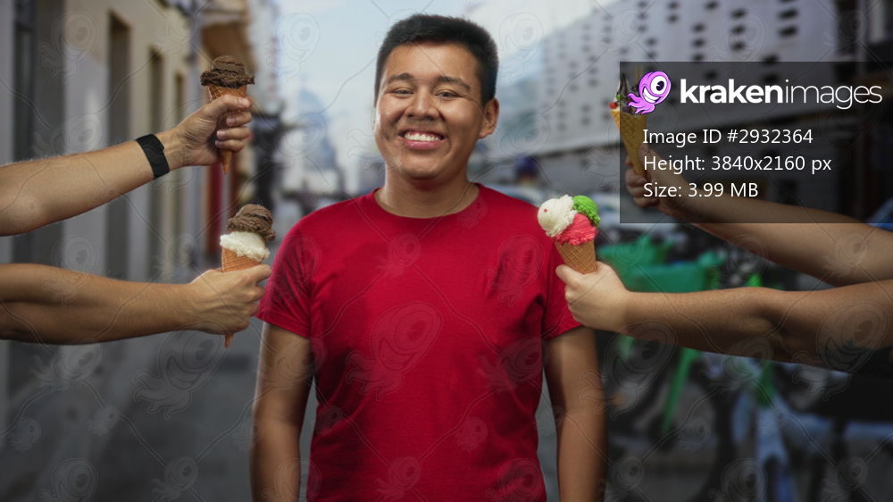 Man with red shirt surrounded by multiple hands offering ice cream cones on a city street; temptation amused.