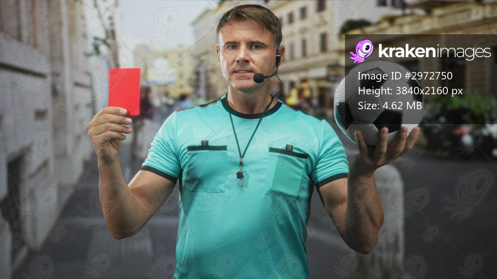 Man referee holding red card and soccer ball on street with whistle headset and raised hand; discipline fair play.