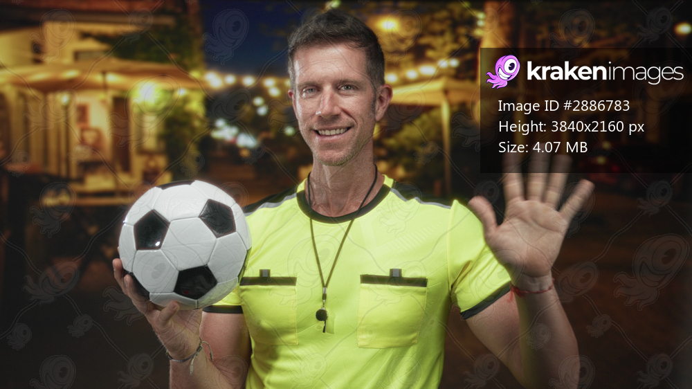 Man referee holding soccer ball with palm raised on street in neon yellow jersey and whistle visible; fair play authority.