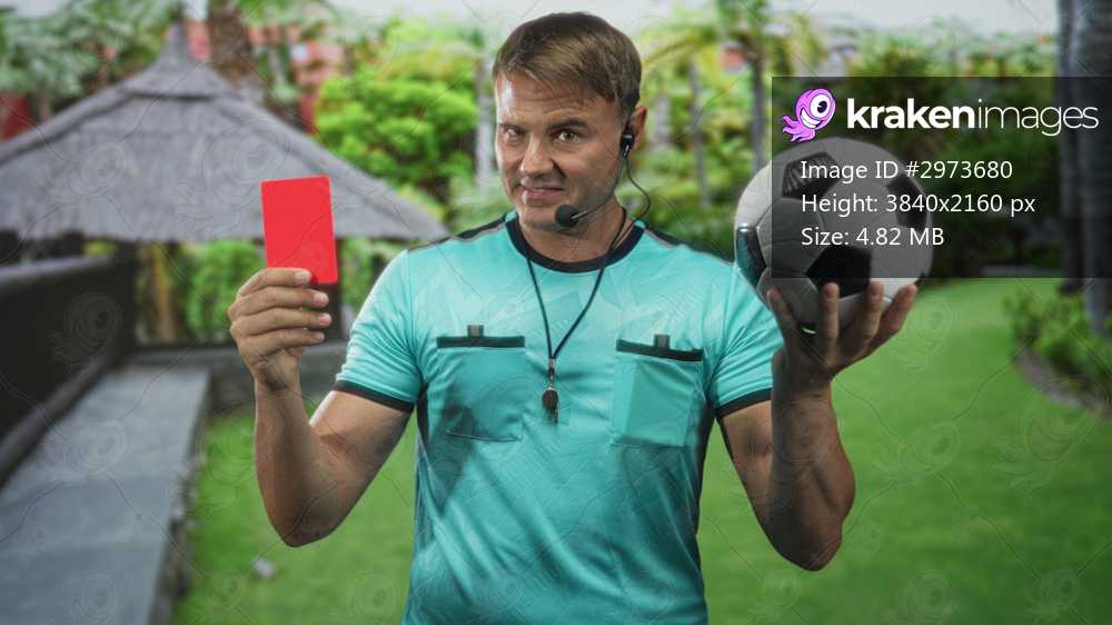 Man referee holding soccer ball and showing red card with right hand in building courtyard, wearing whistle and headset; firm authority.