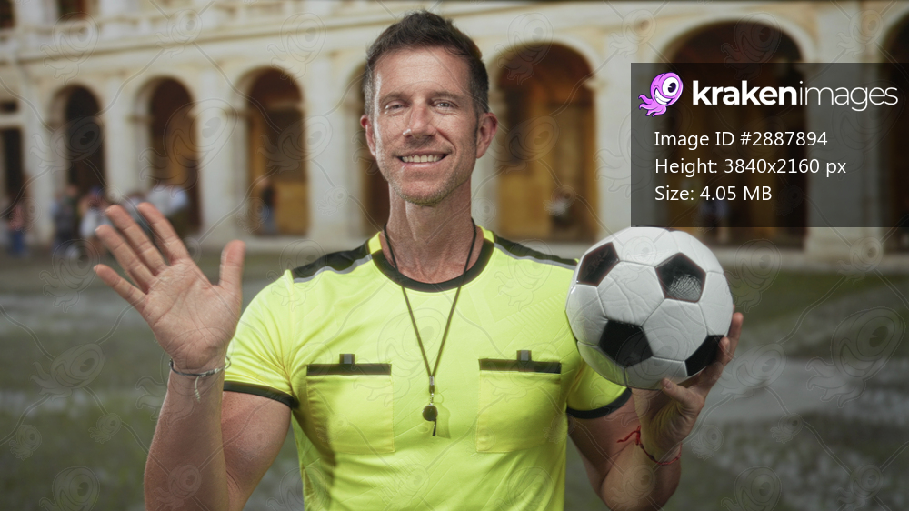 Man referee holding soccer ball and waving hand in building old town plaza wearing neon yellow shirt and whistle; welcoming greeting.