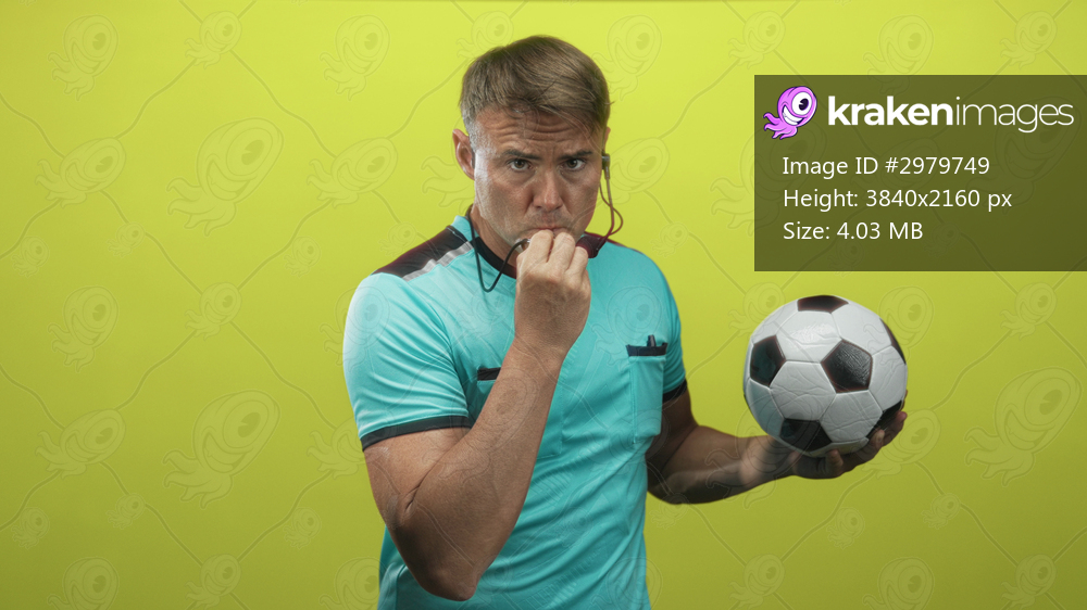 Man referee holding soccer ball, wearing headset and whistle at mouth, hand gripping ball and pointing forward in studio; authority.