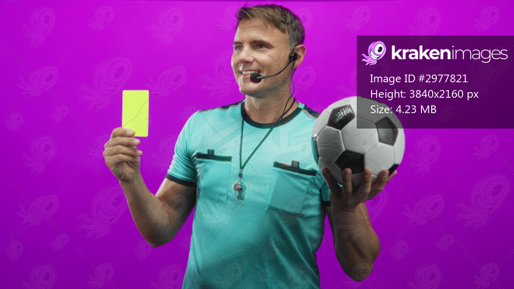 Man referee holding yellow card and soccer ball with hand raised, smiling with headset mic and whistle on lanyard in studio; authority.