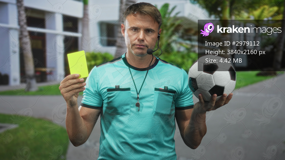 Man referee holding yellow card and soccer ball on street, wearing whistle and headset, hand raised showing card and ball; authority discipline.