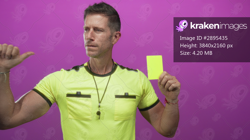 Man referee holding yellow card and thumb pointing at card in magenta studio with whistle visible; stern discipline.