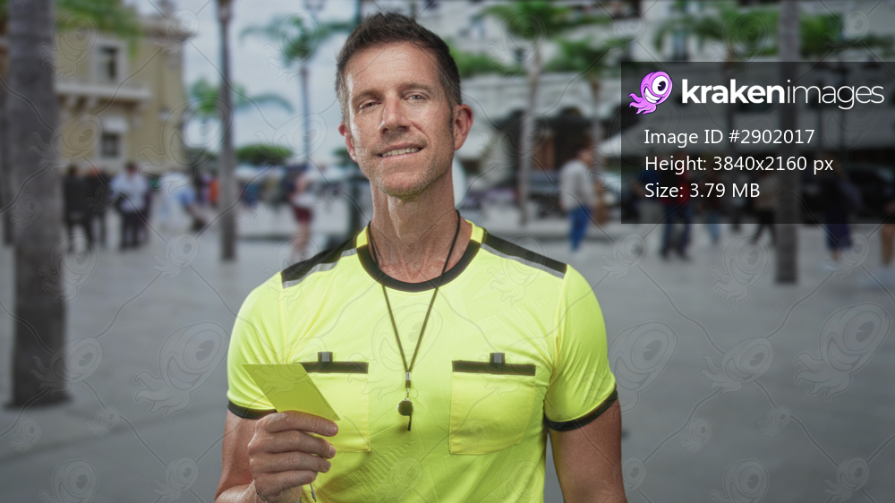 Man referee holding yellow card and whistle, hands visible and gripping card, wearing neon shirt in a street setting; authority.