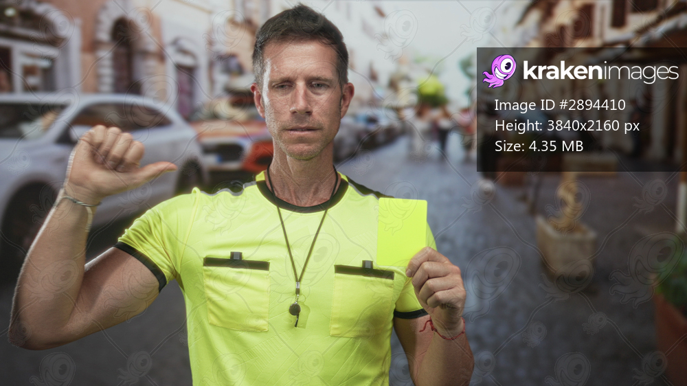 Man referee holding yellow card and whistle on street, thumb pointing to card; authority discipline fairness.