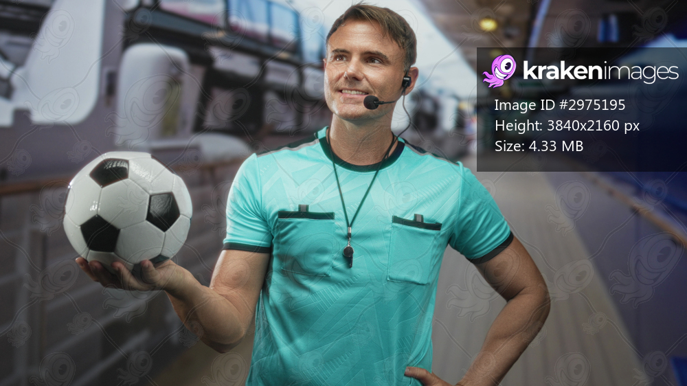 Man referee holds soccer ball in hand, whistle visible and headset mic on in building corridor; confidence authority.