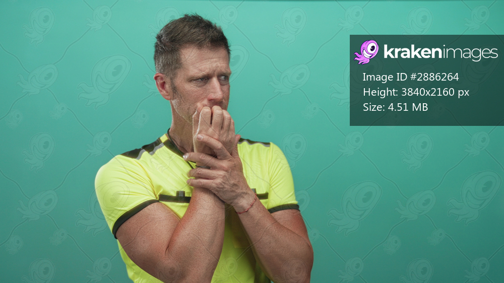 Man referee in neon yellow shirt biting nails with whistle on lanyard in studio turquoise; anxiety pressure.