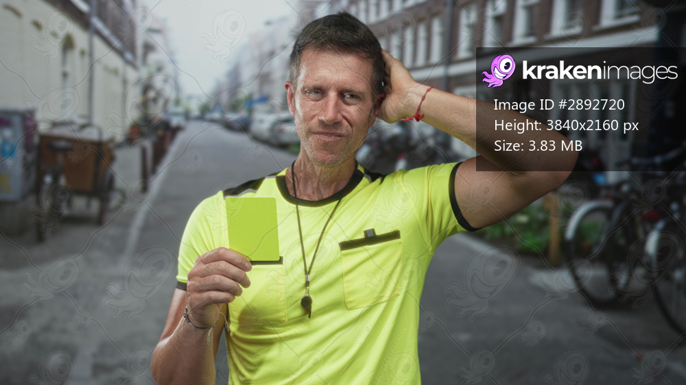 Man referee in neon yellow shirt holds green card and whistle necklace and raises right hand palm up showing bare forearm on a city street; authority duty. - Kraken Images