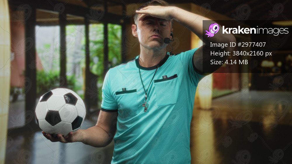 Man referee in turquoise jersey holding soccer ball, hand covering eyes, whistle and headset visible, standing in building lobby with windows and lamps; frustration doubt pressure. - Kraken Images