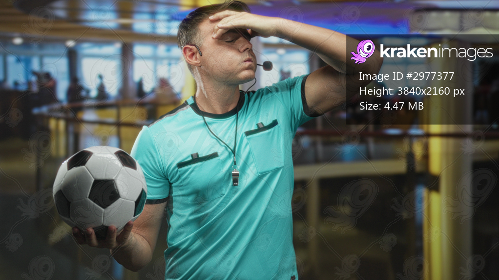 Man referee in turquoise shirt holds soccer ball in one hand while pressing forehead with his hand and wearing a headset mic in an airport concourse; fatigue. - Kraken Images