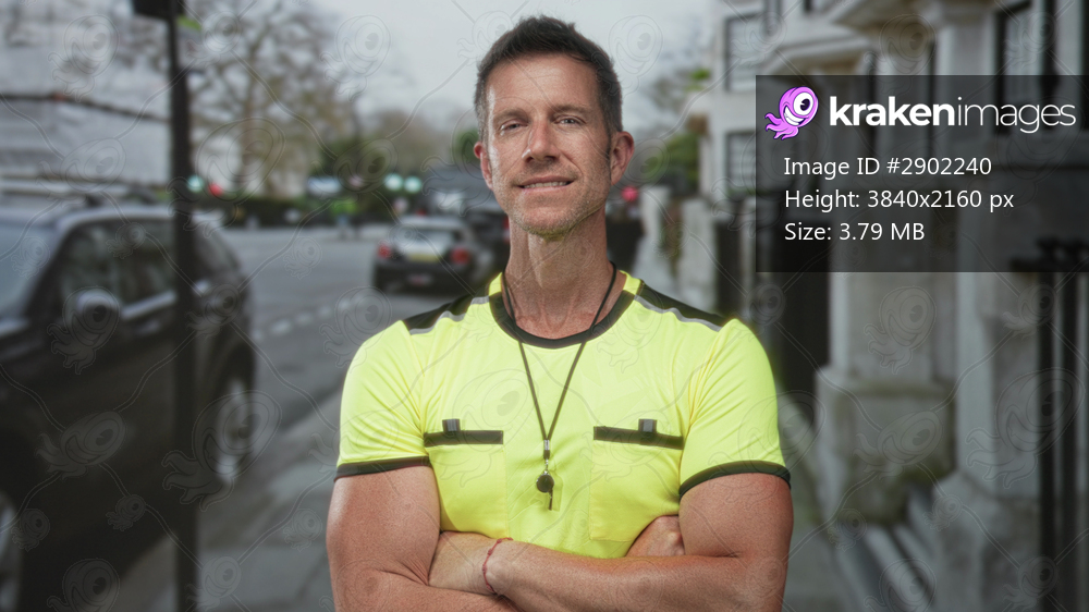 Man referee in yellow shirt with whistle standing with crossed arms on street, forearms exposed and whistle on lanyard; confidence authority duty.