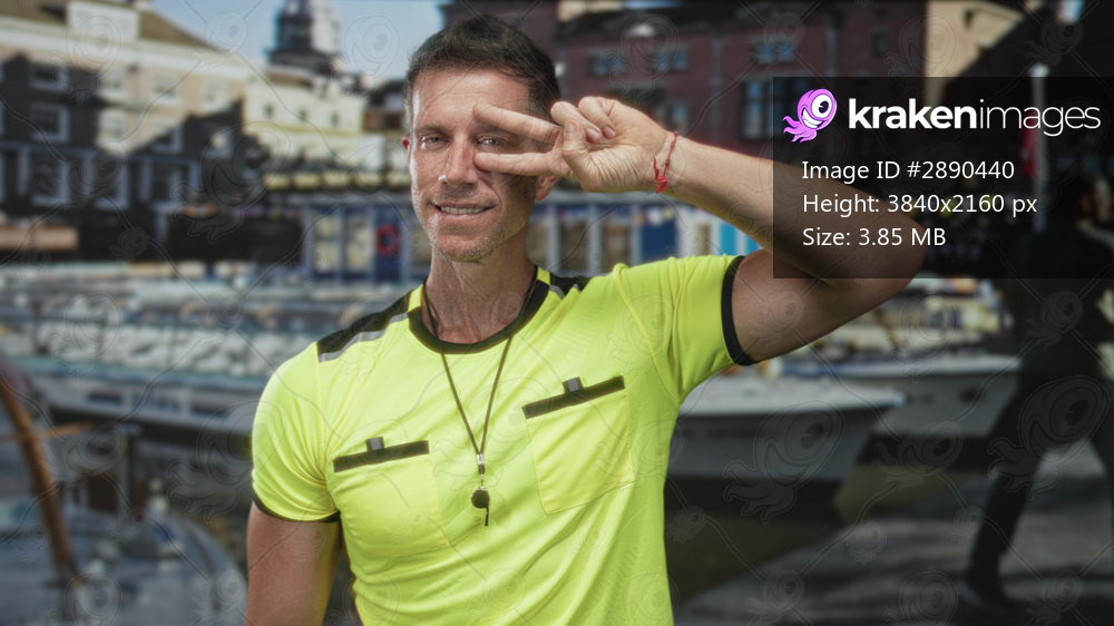 Man referee making peace sign over eye with whistle necklace and visible hand on street in amsterdam; playful confidence.