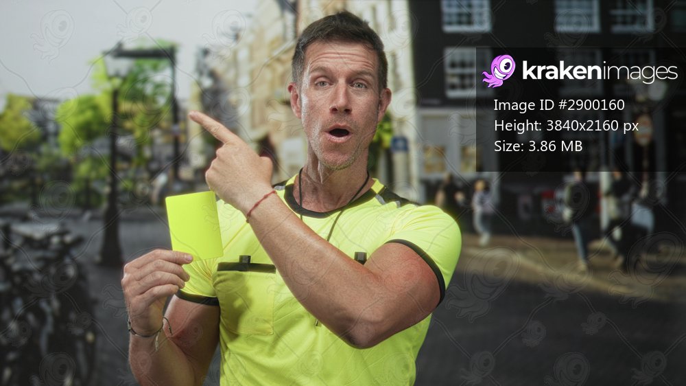 Man referee points finger while holding a yellow card on a city street outside buildings with bicycles and pedestrians, wearing neon shirt and whistle; surprise authority. - Kraken Images