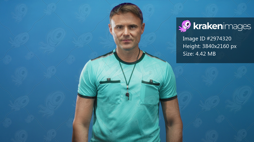 Man referee stands with whistle on lanyard, turquoise referee shirt and hands at sides, stern expression in studio; authority determination.