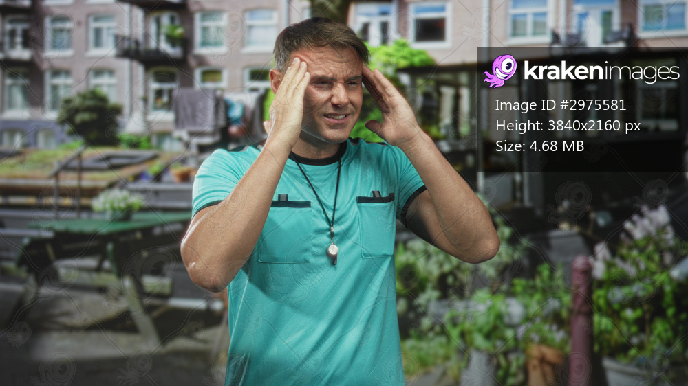 Man referee wearing whistle clutching temples for headache on street with benches and canal boat; stress focus.