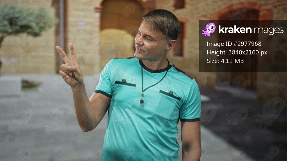 Man referee wearing whistle showing peace sign with hand and teal jersey in street; playful peace.