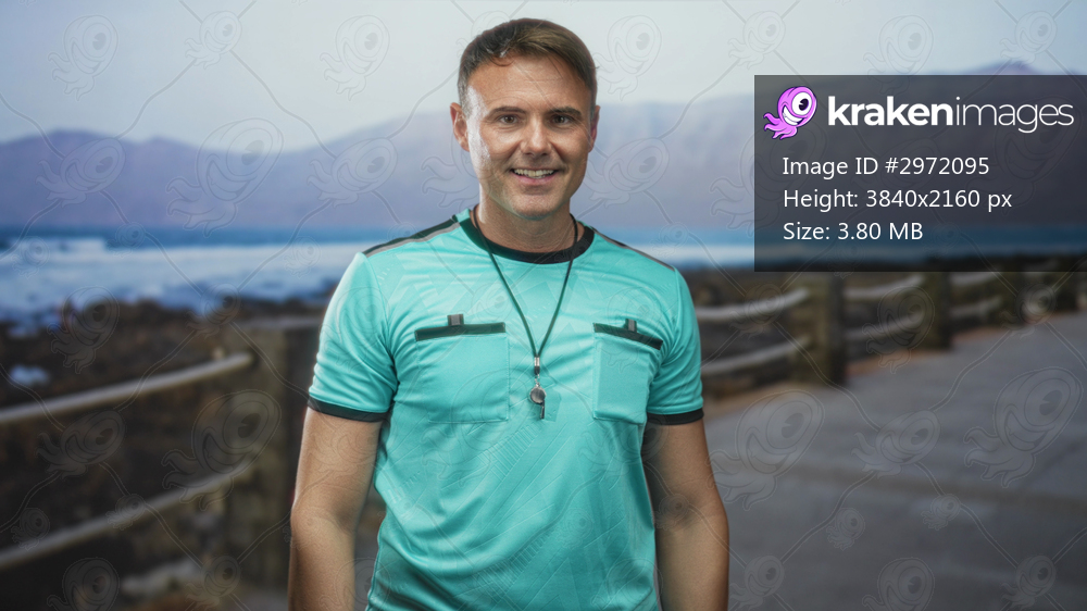 Man referee with whistle around neck smiling and facing camera on street promenade; confidence fairness.