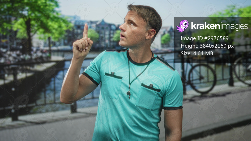 Man referee with whistle pointing index finger on street canal railing by bicycle, wearing teal shirt; confidence guidance.