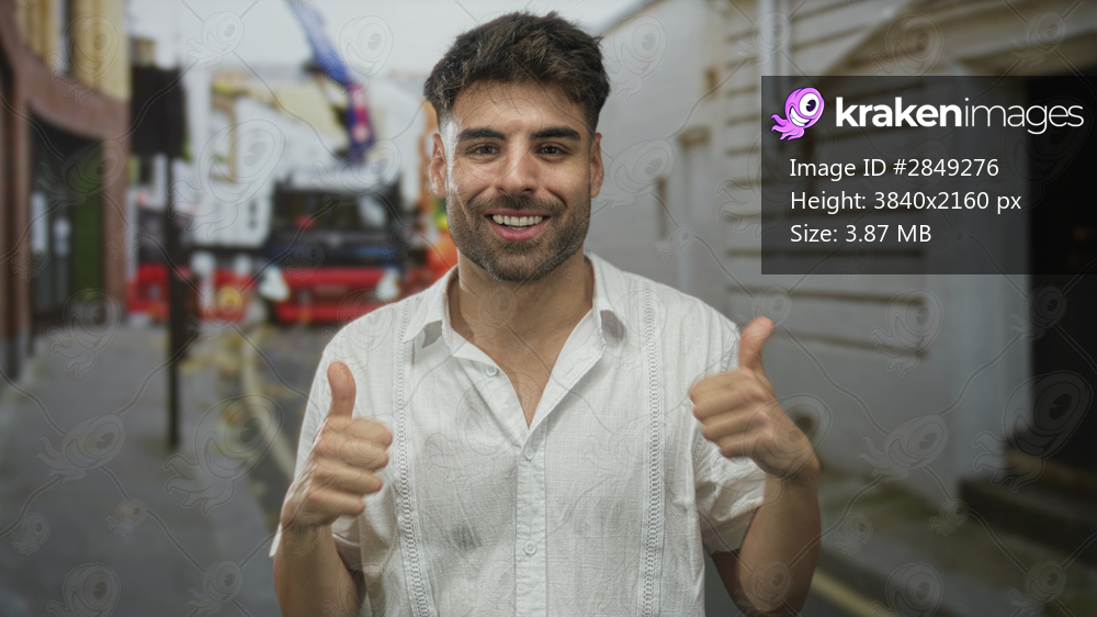 Man removes hands from eyes on narrow street lined with aged building wall and parked bus in broad daylight; surprise reaction.