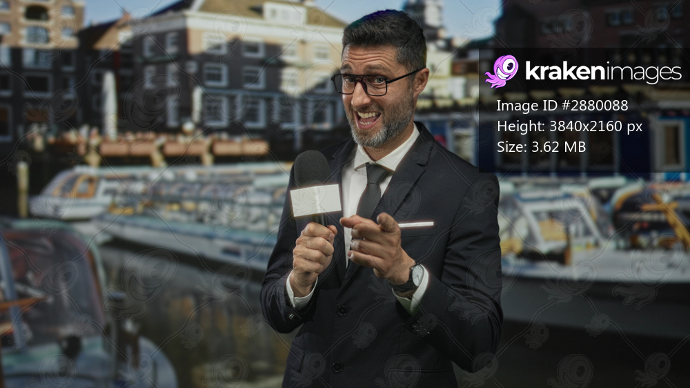 Man reporter holding microphone and pointing finger at camera on an amsterdam canal street; confident reporting.