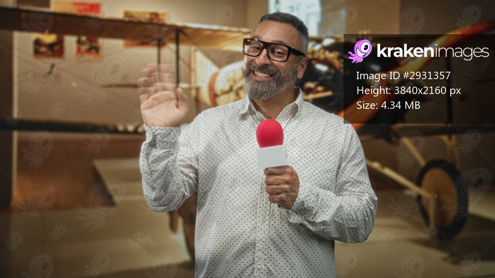 Man reporter holding microphone waves hand in museum building beside vintage plane exhibit; cheerful reporting.