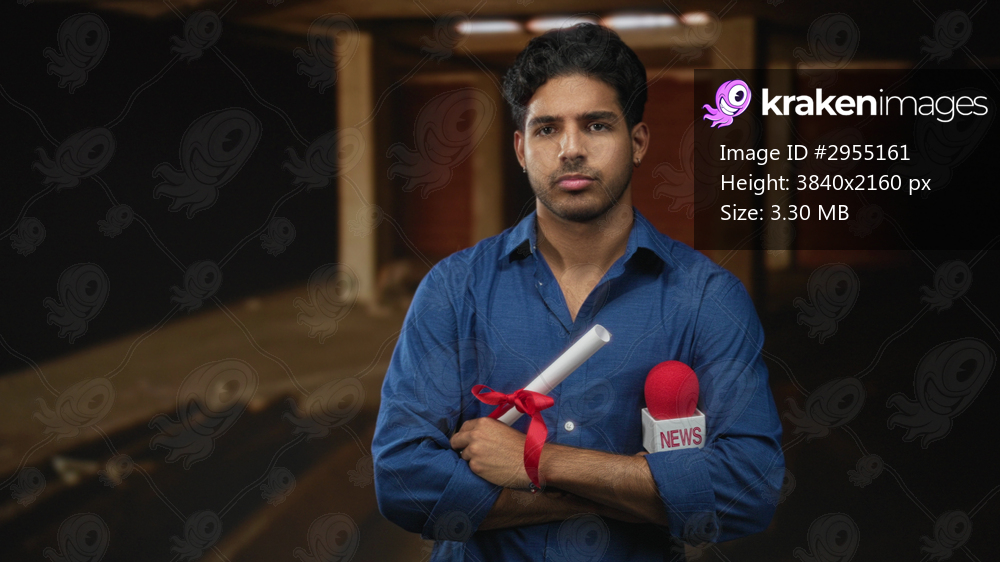 Man reporter holding news microphone and rolled diploma tied with red ribbon, arms crossed, wearing blue shirt in a building; contemplation uncertainty. - Kraken Images