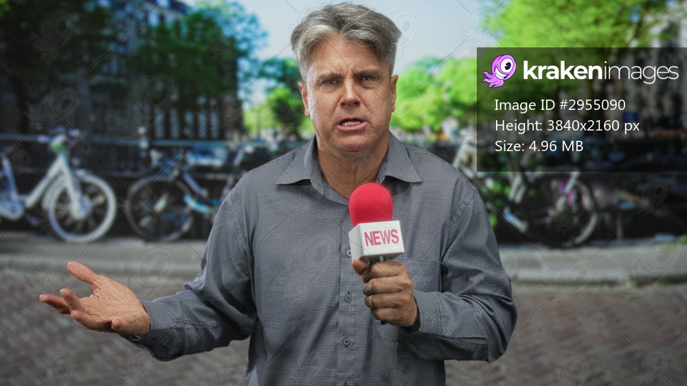 Man reporter holding red microphone, hand gesturing while speaking on street, wearing gray shirt; urgent report.