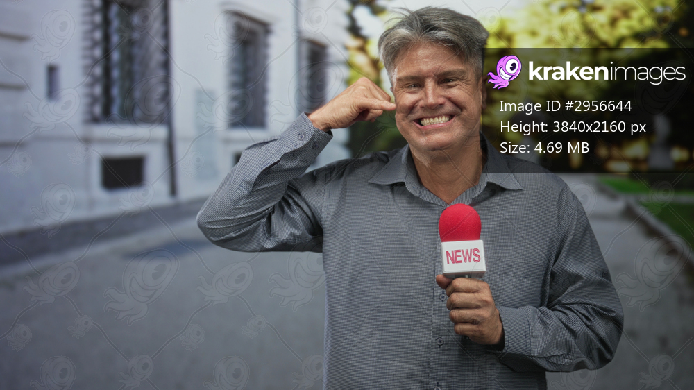 Man reporter holding red microphone with news label, finger to cheek gesture while smiling on a street near a building facade; playful charm.