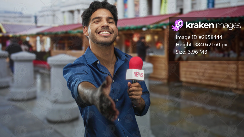 Man reporter holds news microphone and extends hand for handshake on street market; live reporting excitement.