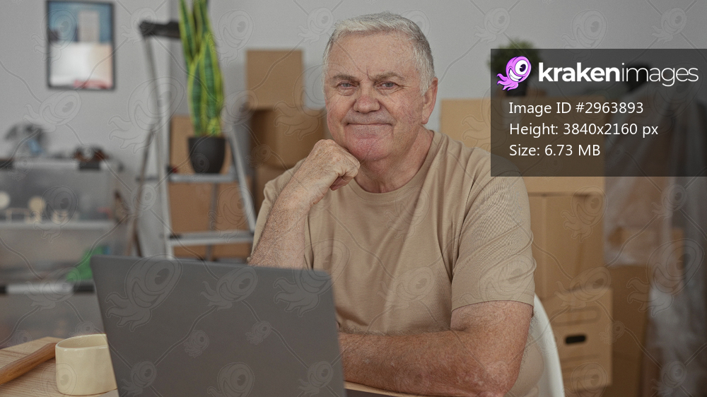 Man resting chin on hand at laptop amid packed moving boxes, ladder and potted plant in a building; serenity reflection.