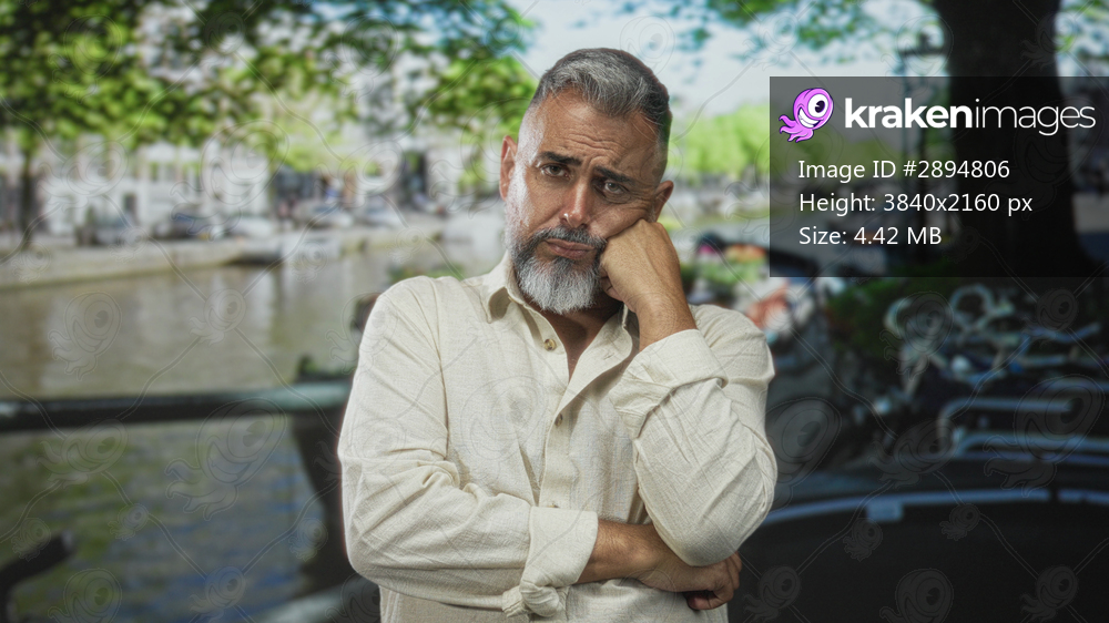 Man resting hand on cheek on an amsterdam street by a canal, wearing a light shirt and frowning; pensive reflection.