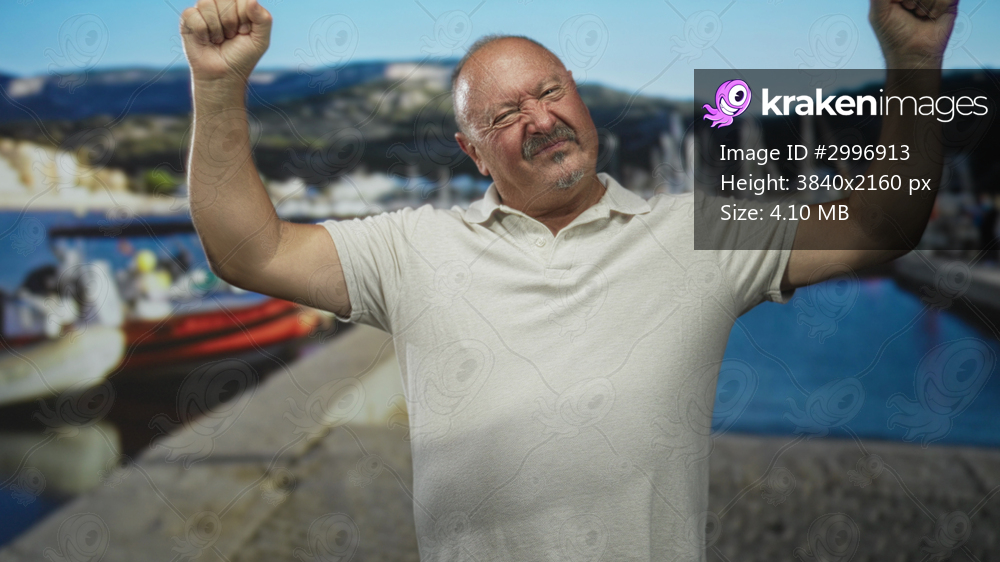 Man resting with hands pressed to cheek wearing white polo in a studio backdrop of a marina pier; rest relaxation vacation.