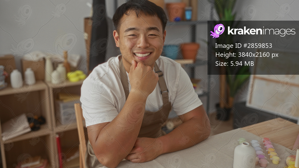 Man rests chin on hand at pottery table surrounded by ceramics, paint pots and wooden shelves in a studio filled with natural light; serenity.