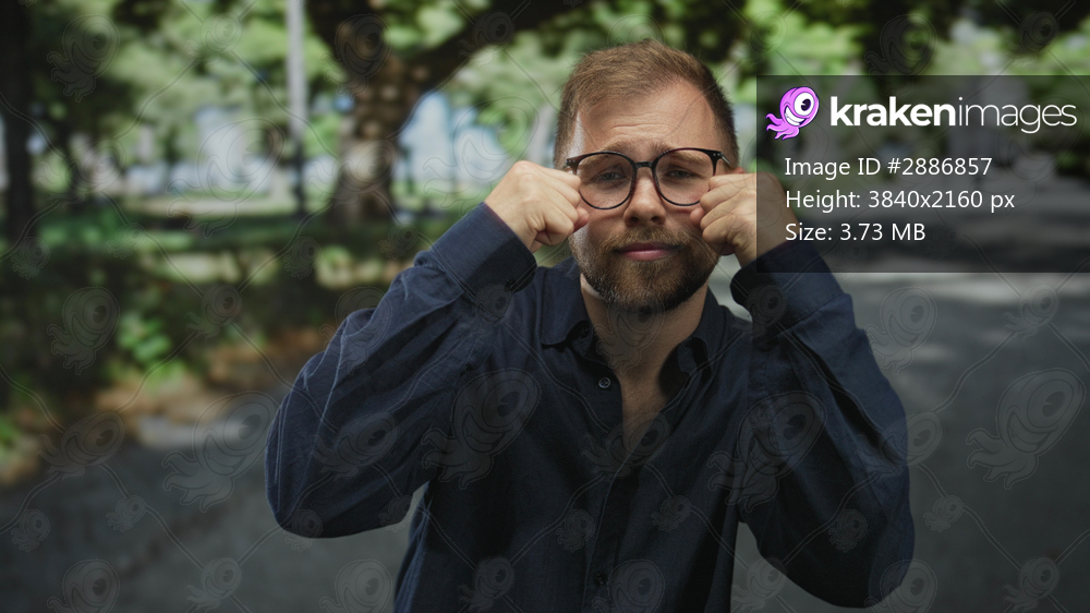 Man rubbing eyes and adjusting glasses with clenched fists on a sunlit tree lined park path; tiredness.