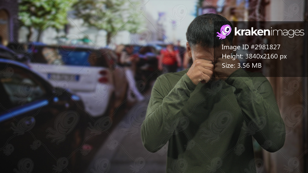 Man rubbing eyes with both hands on a busy street with parked cars and narrow sidewalk; sadness resilience.