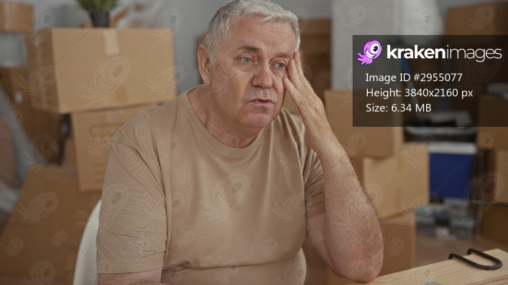 Man rubbing eyes with hand among stacked moving boxes in building during packing and storage; tired relocation tasks.