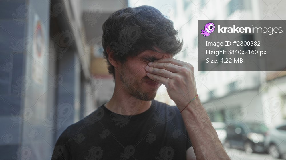 Man rubbing eyes with hand on busy street lined with cars and tall buildings in city center; urban exhaustion.
