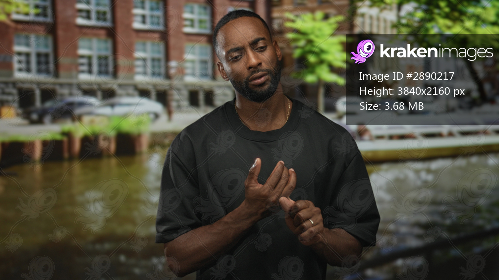 Man rubbing fingers with visible hands and ring on canal near brick building; introspection reflection contemplation.