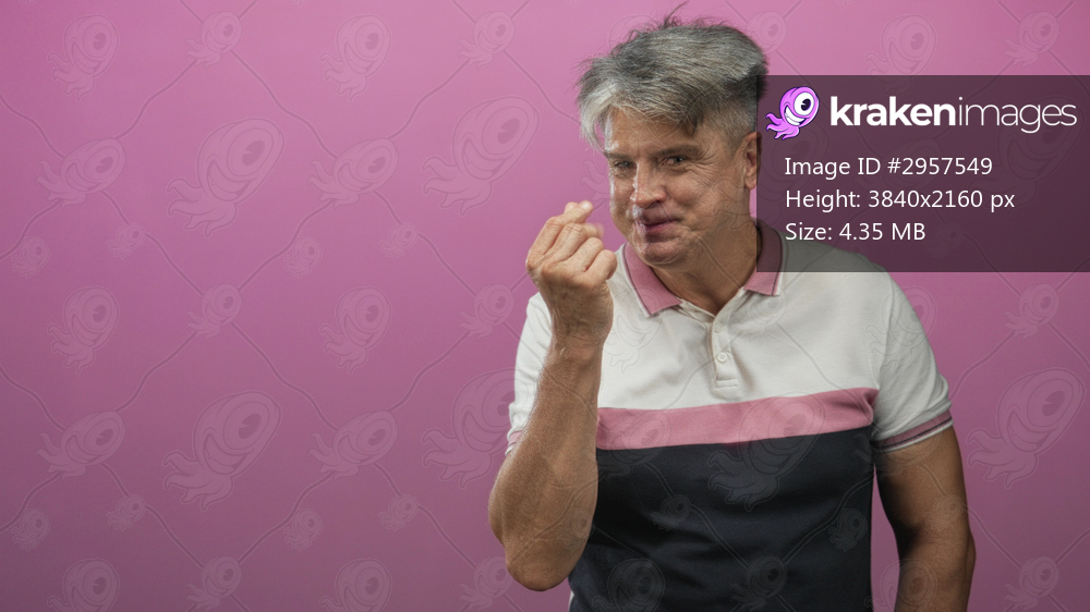 Man rubbing hands and pinching fingers in a pink studio wearing a polo shirt with grey hair, gesturing and smiling slightly; playfulness.