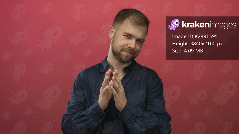 Man rubbing hands together, bare hands forward, posed in studio against a red backdrop; confidence ambition.