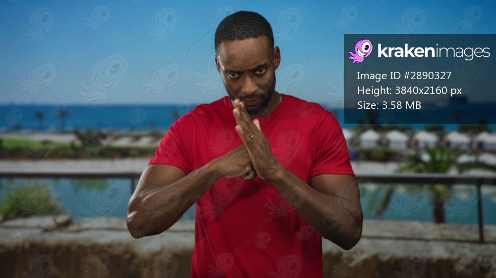 Man rubbing hands with visible wedding ring on balcony street by the seaside in a red shirt and intense gaze; determination.