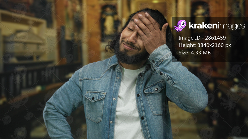 Man rubbing his eye inside a church building, hand covering face in denim jacket and white shirt; fatigue reflection.