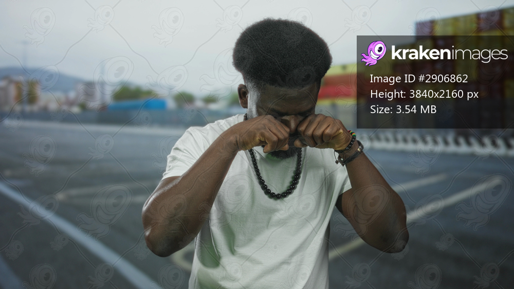 Man rubbing his eyes with clenched fists on a street by shipping containers at a port loading area, boats visible; urban fatigue.