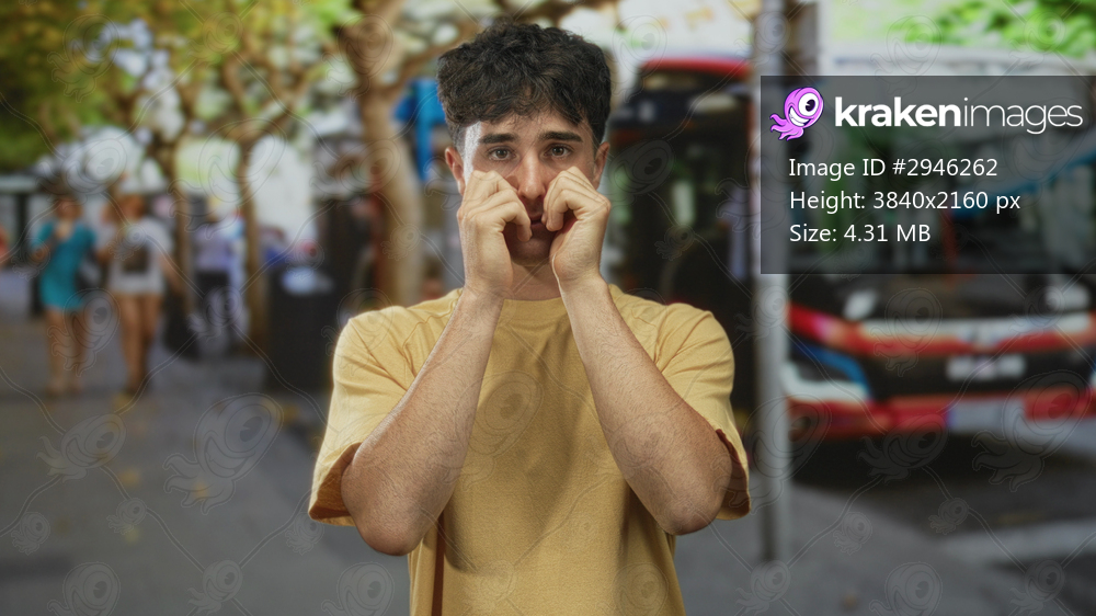 Man rubbing his eyes with hands at a busy city street bus stop wearing a yellow tshirt; urban fatigue.